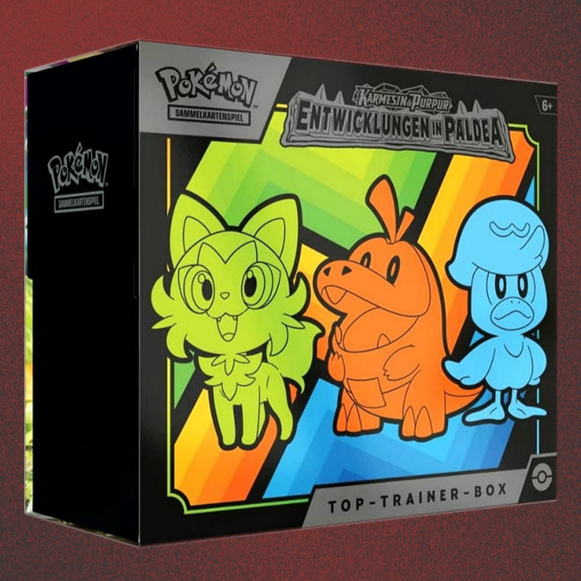 Mit der Top-Trainer-Box „Entwicklungen in Paldea“ begleiten dich Felori, Krokel und Kwaks auf deinem nächsten TCG-Abenteuer. Diese Box ist ideal für alle, die den neuen Generation-9-Pokémon eine Bühne geben wollen – mit exklusivem Zubehör, hilfreichen Spielmaterialien und natürlich: jede Menge Boosterpacks.